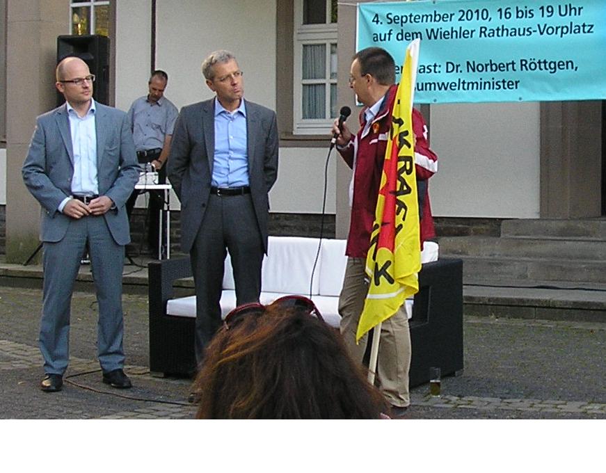 An dieser Botschaft kam der Bundesumweltminister als Gast bei der Sommerlounge-Veranstaltung der Wiehler CDU auf dem Rathaus-Vorplatz am 04.09. nicht vorbei: die Atomkraftgegner stellten rund ein Drittel der Anwesendenden. Lange mussten alle miteinander auf das Eintreffen von Dr. Norbert Röttgen warten, erst kurz nach 18 Uhr führ endlich die Limousine mit dem Berliner Kennzeichen vor. Der Presse war es dann kaum möglich eine Fotoaufnahme des Ministers ohne gelbe Fahnen mit der roten Anti-Atom-Sonne zu machen.