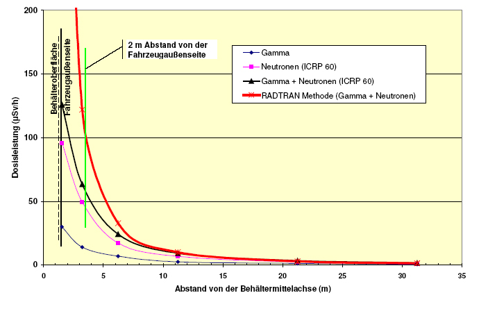 Die Strahlungswerte für einen Abstand von 2 m Entfernung vom Transportfahrzeug sind von besonderer Bedeutung, da in den Vorschriften für Gefahrguttransporte für diesen Abstand ein Grenzwert festgelegt ist. Laut international geltender Transportbestimmungen für Gefahrgüter vom Typ B, und dazu gehören die Castortransporte, darf in 2 m Entfernung vom Gefahrgut eine Strahlendosisleistung von 100 µSv/h an keinem Punkt überschritten werden, dass die Strahlungsintensität mit zunehmenden Abstand vom Castorbehälter abnimmt. Diese Abnahme folgt in geringer Entfernung vom Behälter einer Abnahme mit dem Quadrat der Distanz (1/r2 Abhängigkeit) und ist in Abbildung 2 verdeutlicht. Da die Entfernung zum Castorbehälter etwas schwankte, wurde die Gesamtdosisleistung für eine Entfernung von 6.5 m berechnet. Der oben ermittelte Messwert von 4.8 µSv/h kann so auf eine entfernungskorrigierte wirksame Gesamtdosisleistung von etwa 101.4 µSv/h im Abstand von 2m extrapoliert werden.
